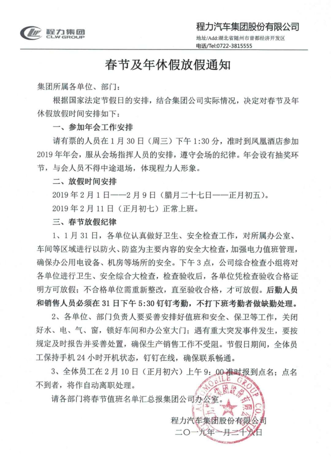 導讀:湖北程力集團經公司各部門商議決定,2019年春節(jié)假期從2019年2月1號(農歷2018年臘月27),到2019年2月11號(農歷2019年正月初七)正式上班,請各部門安排好自己的…