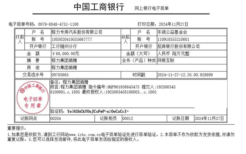 “產(chǎn)業(yè)興旺造福一方,托起千萬個(gè)夢想”、“深耕沃土實(shí)干興邦,共同富裕初心不忘”,“程力人有擔(dān)當(dāng)……”,這是中國民企500強(qiáng)程力汽車集團(tuán)股份有限公司《程力之歌》中激昂豪邁歌詞的真情流露,也是程力人勇于踐行社會(huì)公益事業(yè)的真實(shí)寫照;程力人20余年來砥礪奮進(jìn),始終把公益事業(yè)放在集團(tuán)公司發(fā)展的重要位置,堅(jiān)持做最有溫度最有擔(dān)當(dāng)?shù)膼坌钠髽I(yè)楷模,程力人公益之路愈久彌新不遺余力,譜寫了一曲曲令人動(dòng)容的新時(shí)代贊歌,那些過往的精彩畫卷仿佛蒙太奇一般呈現(xiàn)在我們眼前。 2024年11月27日,程力汽車集團(tuán)旗下核心企業(yè)----程力專用汽車股份有限公司,向東潤公益基金會(huì)捐款60000元,用于弘揚(yáng)公益精神和助力國家科學(xué)人才培育,以及賑災(zāi)濟(jì)難、撫貧濟(jì)困、獎(jiǎng)教助學(xué),改善經(jīng)濟(jì)欠發(fā)達(dá)地區(qū)青少年的生活、學(xué)習(xí)條件,幫助其提高自身發(fā)展能力,為國家培養(yǎng)具有國際競爭力的新一代人才做貢獻(xiàn)。 這雖然只是區(qū)區(qū)6萬元愛心捐贈(zèng),但它卻是程力汽車集團(tuán)二十年如一日做公益事業(yè),花費(fèi)數(shù)千萬巨資中的涓涓細(xì)流,是聚溪水成滄海的重要源泉,是生命的贊歌,是無私的奉獻(xiàn);是賑災(zāi)濟(jì)難、扶貧濟(jì)困,獎(jiǎng)教助學(xué)培養(yǎng)人才的大愛善舉,久久為功必成燎原之勢。 上圖:程力汽車集團(tuán)承接的全國工商聯(lián)“萬企興萬村”共建鄉(xiāng)村振興對口幫扶縣----貴州省劍河縣,程力第二批捐贈(zèng)消防灑水車現(xiàn)場,該縣縣委書記楊勝朝致答謝詞。