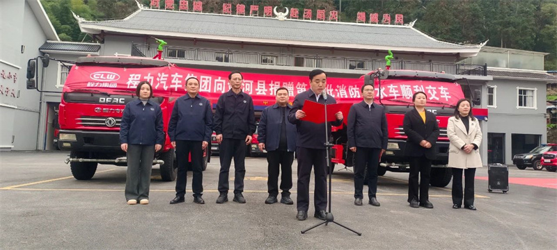 上圖:程力汽車集團(tuán)董事長程阿羅(前排左)向劍河縣副縣長王平(前排右)舉行象征“致富之匙”的車輛捐贈(zèng)儀式。 讓我們把時(shí)光的鏡頭聚焦在2024年11月23日,全國工商聯(lián)執(zhí)委、程力汽車集團(tuán)股份有限公司董事長程阿羅與集團(tuán)黨委書記袁昌才等相關(guān)部門負(fù)責(zé)人,第二次到劍河縣捐贈(zèng)消防灑水車;程董事長與劍河縣委書記楊勝朝、縣長陳林同志等職能部門領(lǐng)導(dǎo),在劍河消防隊(duì)舉行了“踐行萬企興萬村,程力劍河一家親”第二批消防灑水車捐贈(zèng)儀式。 上圖:從左至右分別是劍河縣縣長陳林、程力汽車集團(tuán)董事長程阿羅、劍河縣委書記楊勝朝、程力汽車集團(tuán)黨委書記袁昌才。