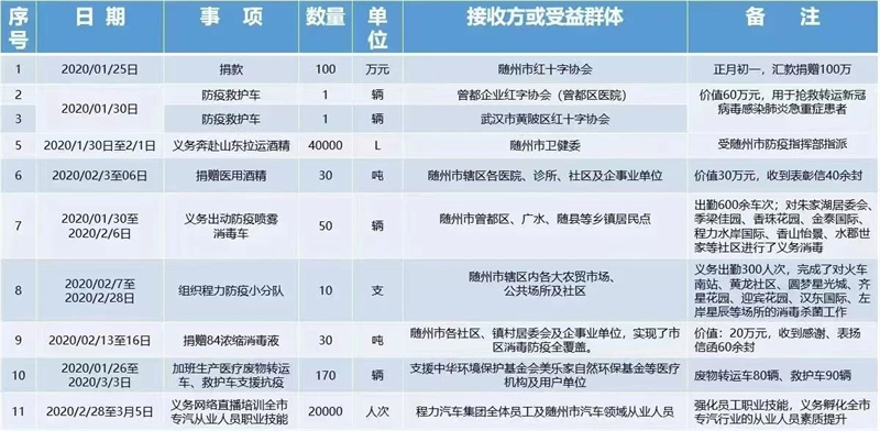 捐贈(zèng)以后,雙方領(lǐng)導(dǎo)和負(fù)責(zé)任人集體合影紀(jì)念。 “躬行踐履始玉成,行而不輟終致遠(yuǎn)”,逆光穿行回望來路,程力汽車集團(tuán)于2023年,按照全國工商聯(lián)的總體部署安排,程力汽車集團(tuán)幫扶的劍河縣“萬企興萬村”鄉(xiāng)村振興項(xiàng)目,向該縣消防大隊(duì)捐贈(zèng)了第一批5輛中大型消防灑水車,程力汽車集團(tuán)與劍河縣政府簽署了合作備忘錄,并提供多項(xiàng)幫扶措施。 程力汽車集團(tuán)自2004年創(chuàng)立以來,就踐行社會(huì)責(zé)任倡導(dǎo)公益事業(yè),在創(chuàng)建世界一流專汽領(lǐng)先企業(yè)的過程中,始終如一的把“精準(zhǔn)扶貧”、“抗疫抗洪、搶險(xiǎn)救災(zāi)”、“萬企興萬村”,以及扶危濟(jì)困、關(guān)愛孤寡老人、殘疾兒童,捐款捐物等公益事業(yè)作為回報(bào)社會(huì)的重要途徑,先后對宣恩縣巴楚風(fēng)印務(wù)公司、恩施移民社區(qū),以及隨州養(yǎng)老院、殘疾孤兒院、萬店鎮(zhèn)新東村扶貧,隨縣柳林鎮(zhèn)洪災(zāi)、廣水雙塘村鄉(xiāng)村振興,抗疫捐款捐物、河南鄭州洪災(zāi)、甘肅積石山地震、河北涿州水災(zāi)、湖南岳陽潰壩搶險(xiǎn),都給予援助救急解困,累計(jì)投入數(shù)千萬公益資金。 一路走來,程力在公益事業(yè)得到了黨委政府的嘉獎(jiǎng)表揚(yáng),現(xiàn)部分擇錄如下以饗讀者:從“千企幫千村”到“萬企幫萬村”,再到“萬企興萬村”,以及從精準(zhǔn)扶貧到扶危濟(jì)困,從抗疫到抗洪、地震救援,程力人無一不沖鋒在前沿,堅(jiān)持不懈的奮斗在公益事業(yè)第一線。