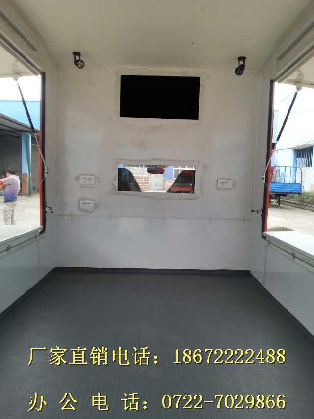 1.車廂頂部封閉選裝通風窗時,高2590mm;選裝頂置空調時,高2890 mm.2左右兩側及后部均可選裝led屏、廣告滾軸燈箱、玻璃窗或上掀門。3.該車前部頂端兩側裝有喇叭,可進行聲音宣傳.4.該車裙邊工具箱艙門可選裝.5.側部和后下部防護裝置為鋼板整體式側圍防護結構,離地高度300mm,側部和后下部防護裝置材料材質為Q235A.發(fā)動機型號/最大凈功率(kw)分別為:JL466Q1/46.56;6.可以選裝不同車體顏色和外觀貼畫.