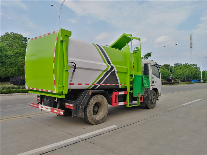 國六東風大多利卡側(cè)裝壓縮掛桶自裝卸式垃圾車箱體為圓弧形新型加強型,箱體容積7.5 立方,壓縮方式為液壓底推推板,提升機為機拉桿式,后門液壓反向鎖死,箱體材料為Q345B錳鋼制作,材料厚度為4個厚,液壓閥為中梅或長源牌,液壓缸為海普瑞斯,齒輪泵為合肥長源牌,箱體尾部加裝污水槽,可有效防止垃圾二次污染。
