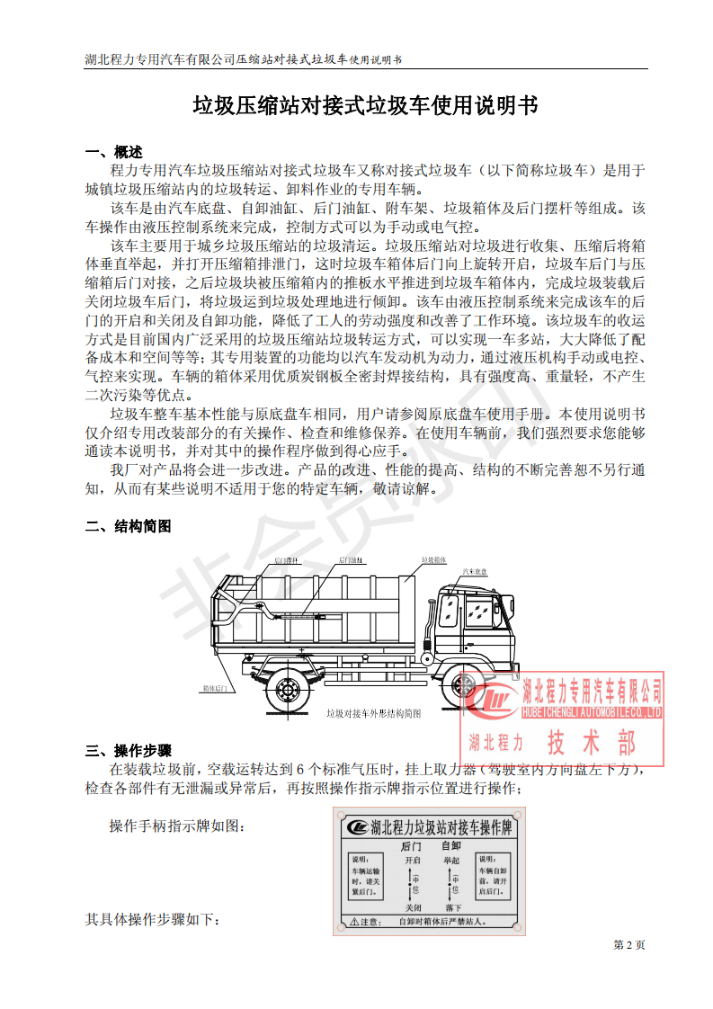湖北程力垃圾壓縮站對(duì)接式垃圾車使用操作說(shuō)明書(shū)