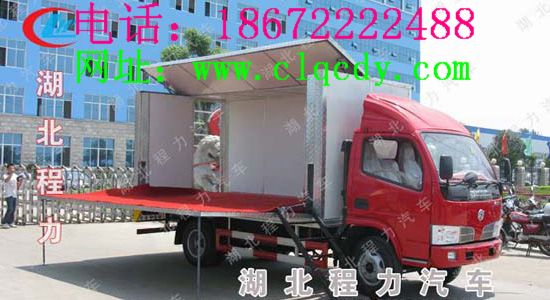 流動(dòng)舞臺(tái)車的結(jié)構(gòu)功能說明:流動(dòng)舞臺(tái)車:通過機(jī)械裝置展開、搭建成具有頂棚和舞臺(tái)版演出的舞臺(tái),并配備安裝舞臺(tái)燈光、音響等所需的專門裝置及電源接口等廂式專用車輛。 舞臺(tái)頂棚 :舞臺(tái)上方用于懸掛燈具、布景,并能遮擋風(fēng)雨和陽光的結(jié)構(gòu)裝置。 頂廂板:車廂體的頂板,升起后作為舞臺(tái)頂棚的固定部分。 側(cè)廂板:廂體的側(cè)板,展開或升起后做為舞臺(tái)的組成部分。廂體的側(cè)板,展開或升起后做為舞臺(tái)的組成部分。 舞臺(tái)臺(tái)板:由支架和強(qiáng)化龍骨、竹夾地板構(gòu)成(耐磨降噪)適用于表演;安裝在整車車架或副車架上的支撐機(jī)構(gòu),演出時(shí)用于支撐舞臺(tái)車體,已形成一個(gè)無降沉、無晃動(dòng)、穩(wěn)定的基礎(chǔ)舞臺(tái)平面的裝置。 舞臺(tái)臺(tái)板滑道:配合活動(dòng)舞臺(tái)臺(tái)板展開、收攏的滑道。 舞臺(tái)臺(tái)板支撐桿:用于支撐活動(dòng)舞臺(tái)臺(tái)板的機(jī)械裝置,能夠調(diào)節(jié)寬度。 燈光桿:布置于頂棚上,用于懸掛燈具的專用結(jié)構(gòu) 景物桿:布置于頂棚上,用于懸掛演出用布景等專用結(jié)構(gòu)。 電控箱:用于放置演出所需的配電設(shè)備及調(diào)光設(shè)備的控制箱。 舞臺(tái)臺(tái)口:靠近觀眾側(cè),舞臺(tái)臺(tái)板上表面與頂棚下表面的矩形區(qū)域。 舞臺(tái)凈高:舞臺(tái)臺(tái)板上表面與頂棚最低點(diǎn)之間的距離。 升降導(dǎo)向架:一種與車架或副車架固定聯(lián)結(jié),在垂直升降過程中可防止頂棚傾斜,在行駛及演出是對(duì)整車及舞臺(tái)起到穩(wěn)定作用的框架結(jié)構(gòu)。 廂體整體采用沖壓件組合骨架,外板為鋁合金平板,內(nèi)飾為防水膠合板,舞臺(tái)板為專用舞臺(tái)防滑板。 右側(cè)外板及頂板右側(cè)通過液壓舉升至與臺(tái)面垂直位置,形成遮陽、擋雨、燈光固定的頂棚及廣告的承載面。 右側(cè)內(nèi)板(舞臺(tái)板)為兩折疊,通過液壓翻轉(zhuǎn)后作為舞臺(tái),舞臺(tái)左右加裝延展板,前面加裝T型臺(tái)。