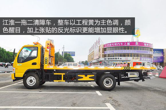 江淮平板一拖二清障車,整車以工程黃為主色調(diào),顏色醒目,加上張貼的反光標識更能增加顯眼性,(如圖,在閃光燈的拍攝下反光出的效果)即使在北方冬季大雪的情況下,也能顯示出顯眼性,充分的保障了行車的安全性。