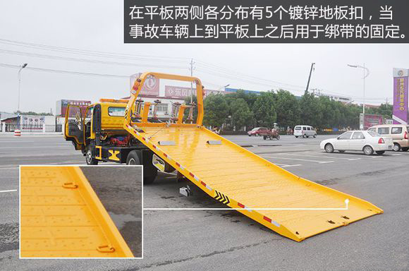 在平板兩側(cè)各分布有5個鍍鋅地板扣,當事故車輛上到平板上之后用于綁帶的固定。
