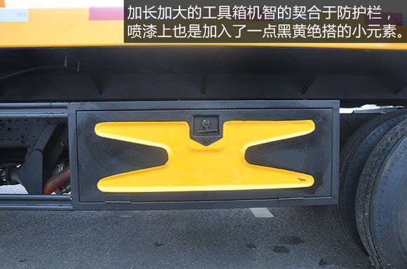 加長加大的工具箱機智的契合于防護欄,噴漆上也是加入了一點黑黃絕搭的小元素,絲毫不顯突兀,完美的融入整車色調(diào)。