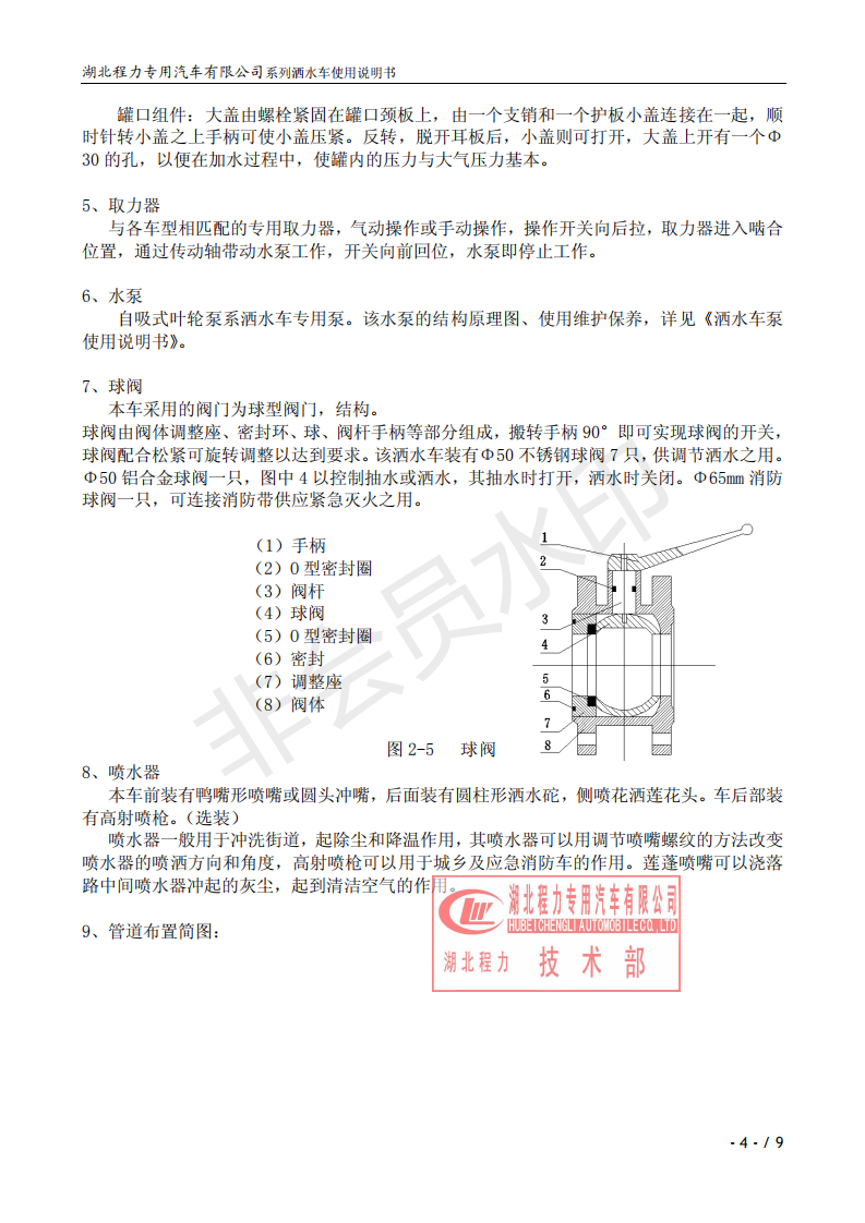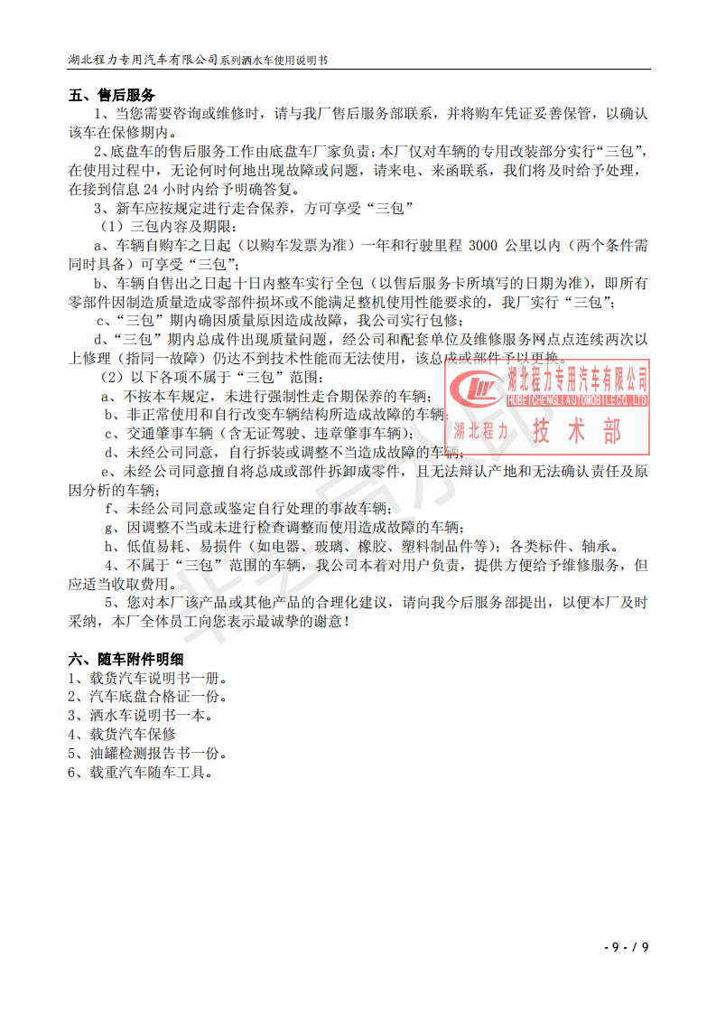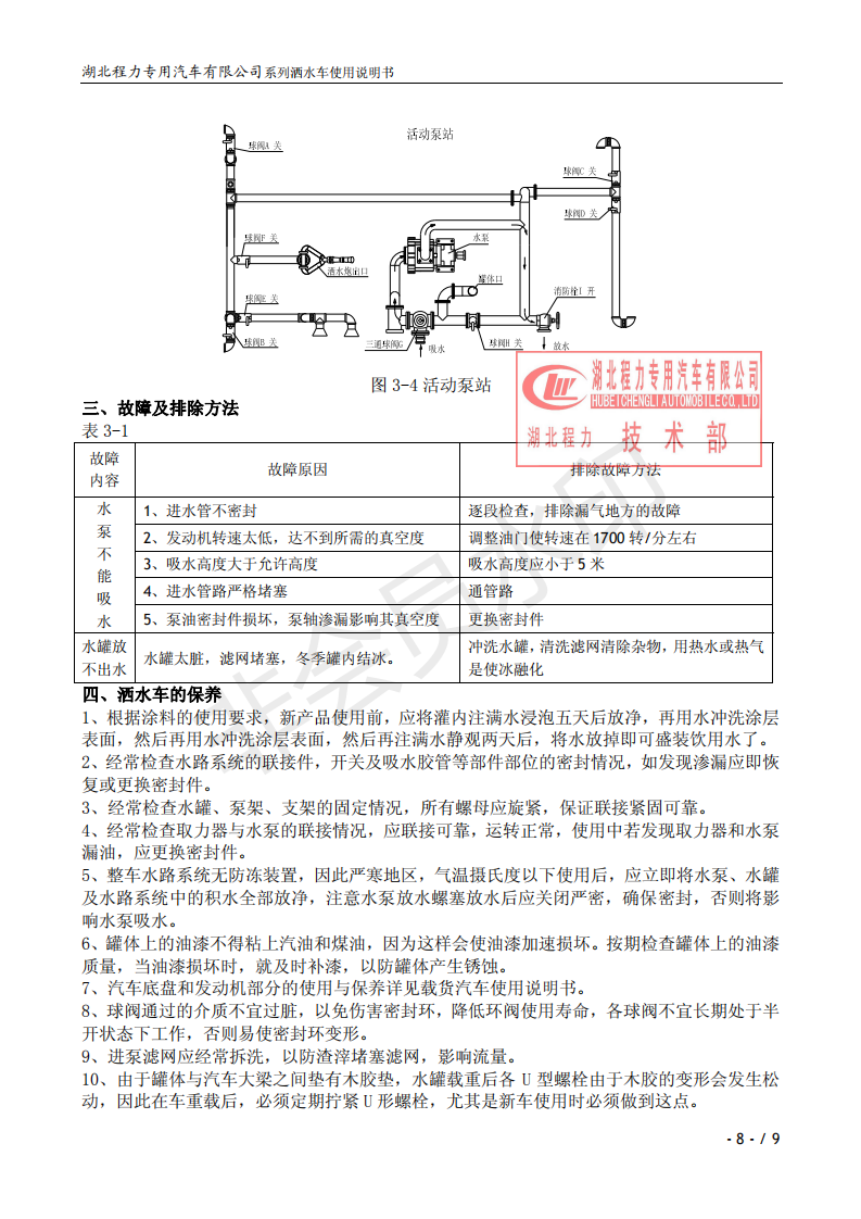 湖北程力專業(yè)生產(chǎn)東風(fēng)小霸王灑水車、東風(fēng)多利卡灑水車、東風(fēng)灑水車、東風(fēng)大金剛灑水車、東風(fēng)140灑水車、東風(fēng)140/47灑水車、東風(fēng)145灑水車、東風(fēng)153灑水車、東風(fēng)1254灑水車、東風(fēng)前四后八灑水車、東風(fēng)天龍灑水車、半掛灑水車、解放系列灑水車、汽油灑水車等各類灑水車。用戶可自帶底盤我廠提供上裝部件的生產(chǎn)改裝。 灑水車前沖(噴)后灑,帶側(cè)噴,罐體后帶工作平臺,平臺上安裝綠化灑水炮,灑水炮可全方位旋轉(zhuǎn),可連續(xù)調(diào)成直沖狀、大雨、小雨、毛毛雨,帶安全護(hù)欄,配備全國質(zhì)量評比第一名的杭州威龍大功率專用灑水泵,泵可自吸自排,安裝過濾網(wǎng),帶消防接口,可通過消防栓進(jìn)水,帶自流閥,隨車選裝20米綠化卷盤,可噴灑農(nóng)藥,罐體金屬漆。 灑水泵情況說明:大功率專用灑水泵,采用國際領(lǐng)先意大利技術(shù),在國內(nèi)生產(chǎn)各系列專用泵已有50年歷史,產(chǎn)品質(zhì)量成熟可靠,設(shè)計(jì)先進(jìn)合理,使用方便快捷,比同類灑水泵壓力大、吸程遠(yuǎn)、使用壽命長,克服其它灑水泵易被雜物纏住、壓力小、吸水慢的缺點(diǎn),引領(lǐng)國內(nèi)外灑水泵行業(yè)標(biāo)準(zhǔn),市場占有率93%。關(guān)于湖北程力灑水車使用說明書介紹如下,用戶不清楚可以直接打印出來。 ![]() ![]() ![]() ![]() ![]() ![]() ![]() ![]() ![]() |