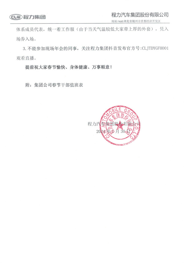 程力汽車集團關(guān)于2024年春節(jié)放假的時間及”網(wǎng)絡(luò)直播年會暨總結(jié)表彰大會的通知