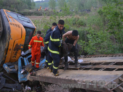 消防官兵到達(dá)現(xiàn)場后,發(fā)現(xiàn)一輛貨車車頭直接扎入溝中,在貨車上的挖掘機(jī)側(cè)翻在一旁,當(dāng)?shù)嘏沙鏊?20急救人員已經(jīng)趕到了現(xiàn)場。見此情形,消防官兵迅速展開營救,但由于貨車狠狠的撞在田埂上,駕駛室已經(jīng)嚴(yán)重變形,消防官兵利用液壓剪擴(kuò)鉗、液壓撐頂器等破拆工具均未能使駕駛室有效擴(kuò)張,而且挖掘機(jī)隨時有壓下來的危險(xiǎn)。于是,中隊(duì)指揮員立即協(xié)調(diào)公安部門,將附近的一輛挖掘機(jī)借調(diào)過來,配合消防官兵實(shí)施營救。 挖掘機(jī)到位后,指揮員立即下令挖掘機(jī)將貨車車身往后牽引,使車頭留有救援空間供消防官兵救援。命令下達(dá)后,救援人員各司其職,迅速的投入到戰(zhàn)斗中去。 19時05分,通過消防官兵1個多小時的緊張救援,貨車司機(jī)被成功救出,但由于撞擊嚴(yán)重,被困時間過長,醫(yī) |