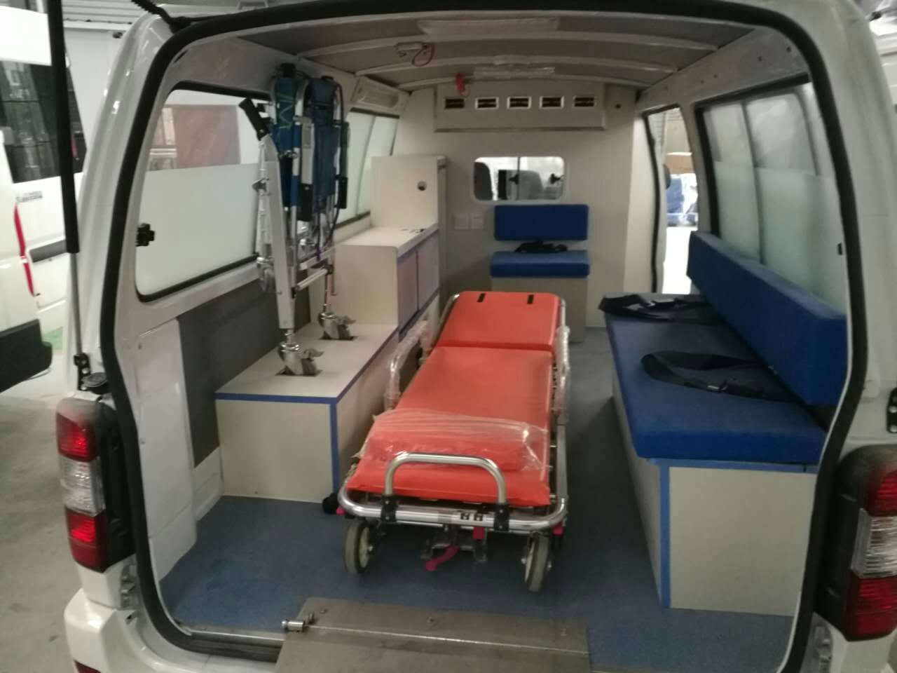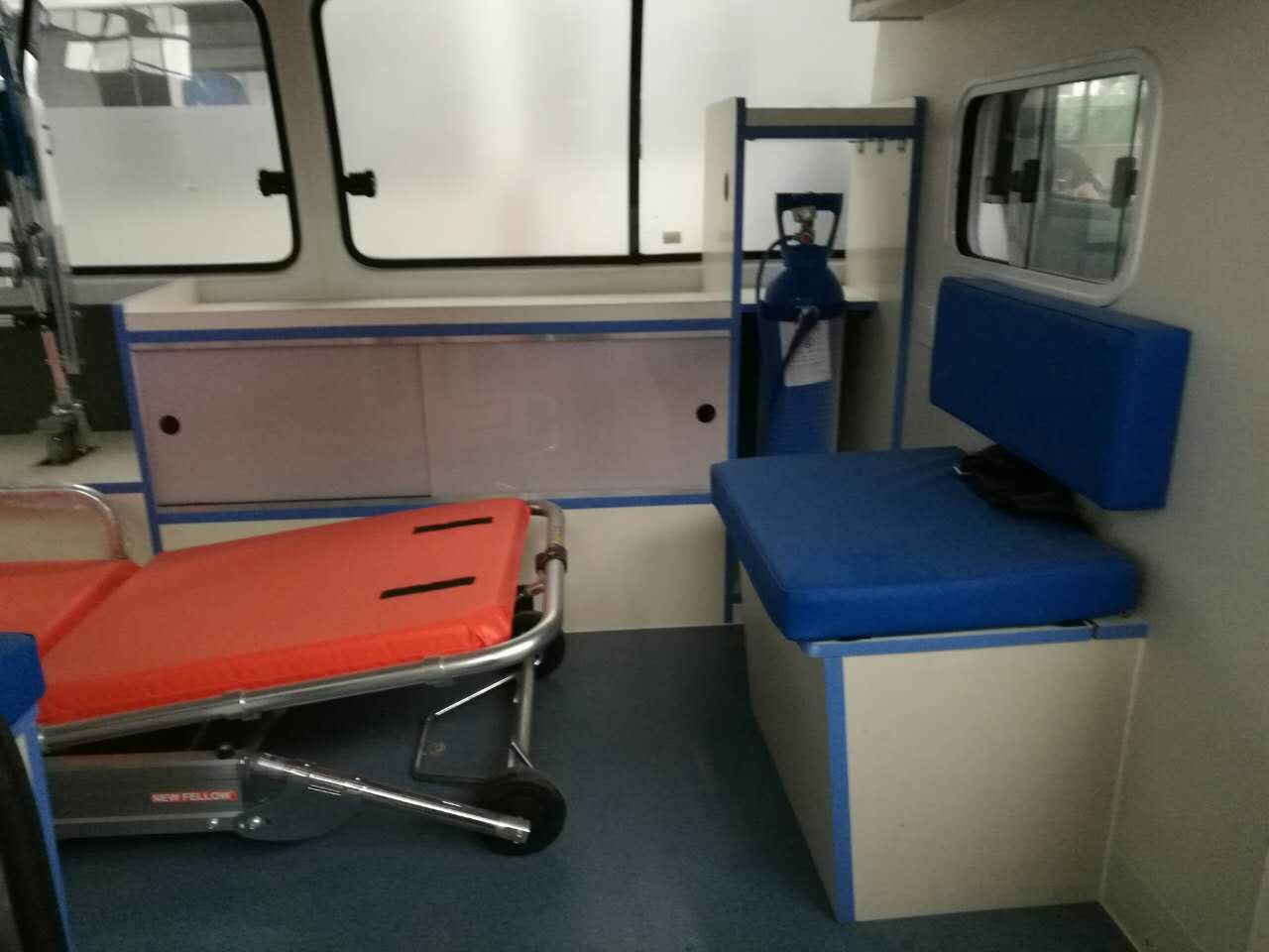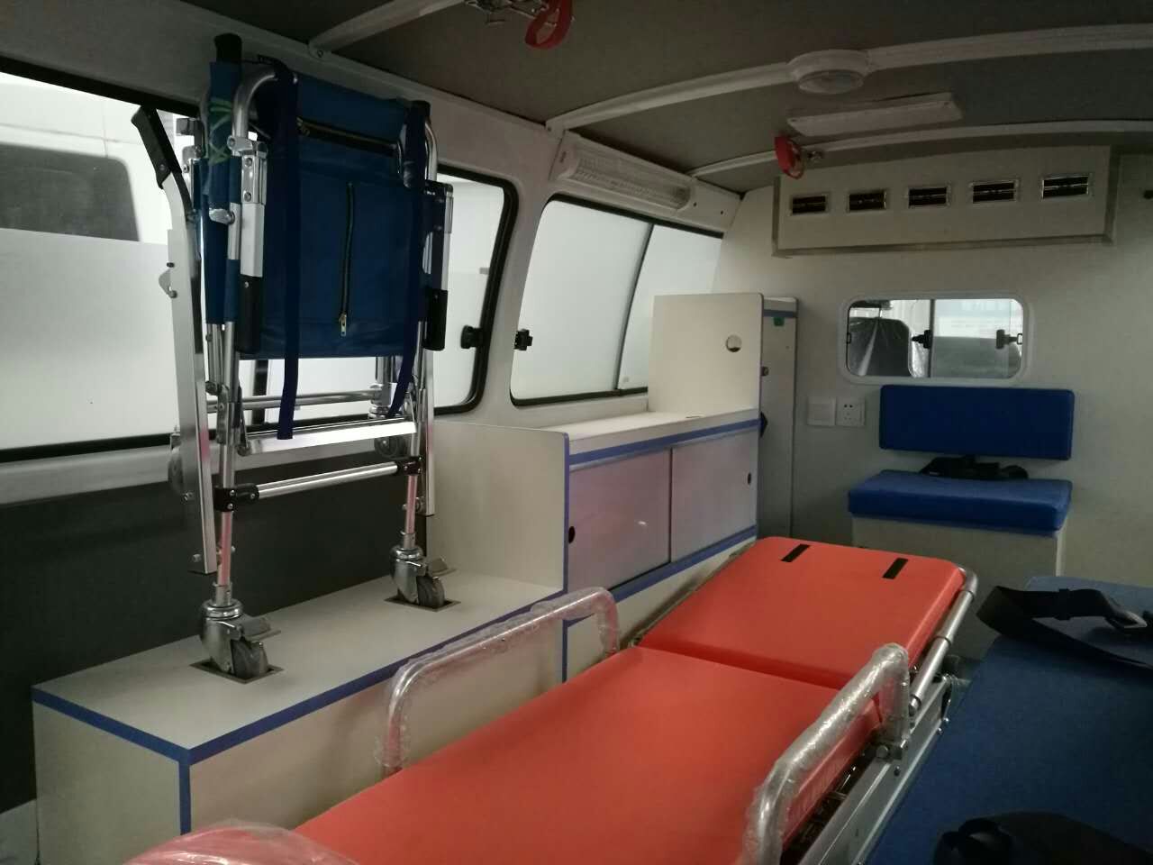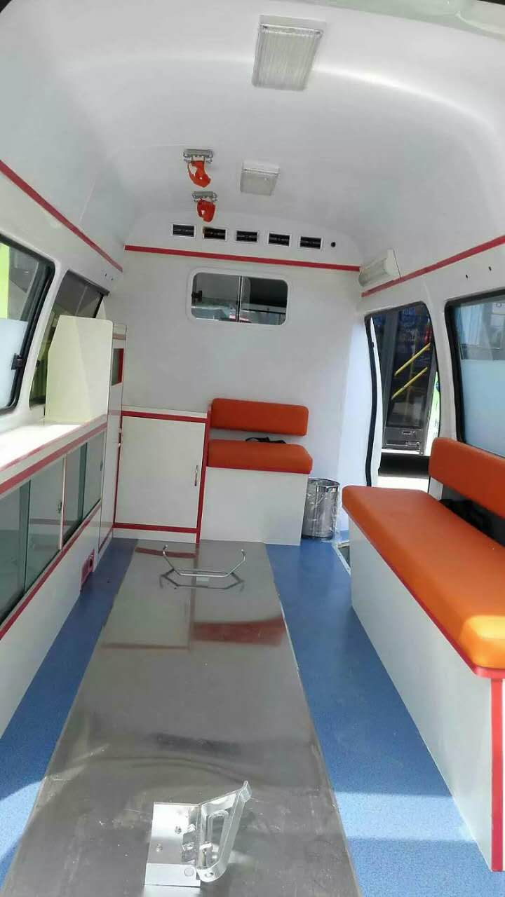 1、便攜折疊式擔架1件;2、醫(yī)藥柜1件;3、固定安裝氧氣瓶1只;4、輸液吊鉤2只;5、消毒燈1只;6、污物桶1只;7、單人座椅3只;8、長條貯藏柜帶2人位軟座墊、軟靠背和安全帶1套;9、中隔斷帶鋁合金滑窗1套;10、前頂裝全藍警燈警報器1套;11、照明燈2只;12、逆變器1只;13、電源插座1組;14、中門上車扶手;15、后門上車踏板;16、醫(yī)用耐磨塑膠地板革;17、貼救護十字標志;廠家銷售熱線:13872882215.