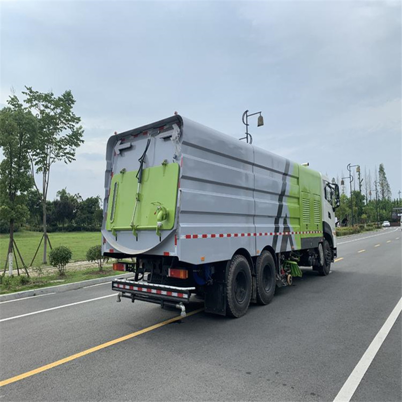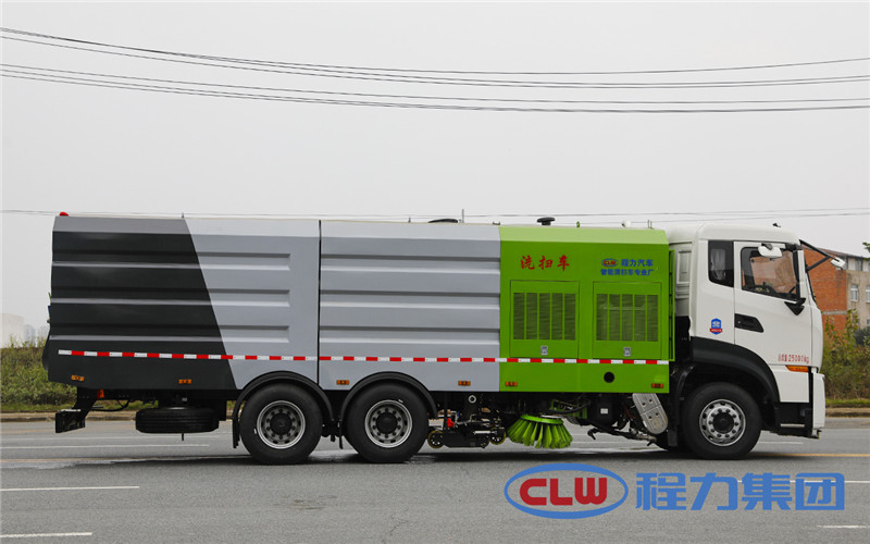 東風(fēng)天龍洗掃車副發(fā)動(dòng)機(jī)驅(qū)動(dòng)風(fēng)機(jī)和高壓水泵,副發(fā)動(dòng)機(jī)采用東風(fēng)康明期6缸柴油發(fā)動(dòng)機(jī)。 風(fēng)機(jī)用8.0高壓離心風(fēng)機(jī),效率高、風(fēng)量大,最高風(fēng)量達(dá)23500m3/h。 東風(fēng)天龍洗掃車高壓水泵采用同際知名T7012IR 型柱塞柱,流量合適,壓力高,允許最高壓力達(dá)10MPa,清水箱充分利用了車載空間,容積大,容積達(dá)12m3。 東風(fēng)天龍洗掃車?yán)洳捎脝螌硬讳P鋼結(jié)構(gòu),傾翻卸料,帶高壓位自潔裝置。自潔裝置可在垃圾箱卸料時(shí)幫助卸料,清洗垃圾箱內(nèi)部。 東風(fēng)天龍洗掃車左右立掃為單掃盤,減少了掃刷數(shù)量和掃刷消耗量,能降低使用成本。左右立掃分開控制,可實(shí)現(xiàn)左掃、右掃和全掃等不同作業(yè)模式。寬吸嘴的吸口寬度達(dá)到2418mm,確保作業(yè)總寬度大于3.5mm。 湖北程力國(guó)六東風(fēng)天龍后雙橋大型洗掃4個(gè)高度可調(diào)的吸嘴輪,能方面調(diào)整和保證吸嘴與路面間的合理間隙。吸嘴內(nèi)高有噴水桿,盡可能多地將高壓洗滌噴嘴布置在吸嘴內(nèi)部,不但清洗效果好,還能最大限度減少高壓水氣流沖起污物產(chǎn)生的二次污染。左右噴水桿安裝在吸嘴上,隨吸嘴升降,結(jié)構(gòu)簡(jiǎn)單緊湊,保證噴水桿的離地高度固定不變,達(dá)到最佳清洗效果。 東風(fēng)天龍洗掃車開式液壓系統(tǒng)驅(qū)動(dòng)左右立掃升降、左右掃肋旋轉(zhuǎn)、吸嘴升降、垃圾箱后門開閉、垃圾箱傾翻復(fù)位等機(jī)械動(dòng)作。底盤變速箱側(cè)取力器驅(qū)動(dòng)低壓水泵,實(shí)現(xiàn)灑水車的低壓沖洗功能。一鍵式作業(yè)起動(dòng)和停機(jī)操作。 東風(fēng)天龍大型洗掃車具有路面清洗、路面清掃、路緣清洗、路緣和路緣石立面洗刷、低壓沖洗、噴霧除塵等多功能。有“全洗掃”、 “左洗掃”、 “右洗掃”、 “全掃”、 “左掃”、 “右掃”6種作業(yè)模式可選擇。選擇“全洗掃”模式清洗廣場(chǎng)和路面,清洗效率高效果好,洗凈率達(dá)90%以上。選擇“左洗掃”或“右洗掃”模式清洗路面和路緣、洗刷路緣石立面。需要進(jìn)行路面清掃或路面保潔作業(yè)時(shí),可選擇掃路模式。需要噴霧除塵時(shí),可開啟噴霧裝置,進(jìn)行噴霧除塵作業(yè)?梢韵駷⑺囈粯訉(duì)路面進(jìn)行低壓沖洗作業(yè)。 東風(fēng)天龍大型洗掃車適用于城市道路、高速公路、廣場(chǎng)、機(jī)場(chǎng)、碼頭、遂道、橋梁、隔離墻避、路緣和路緣石立面的機(jī)械化清洗、清掃、噴霧降塵等清潔作業(yè)。